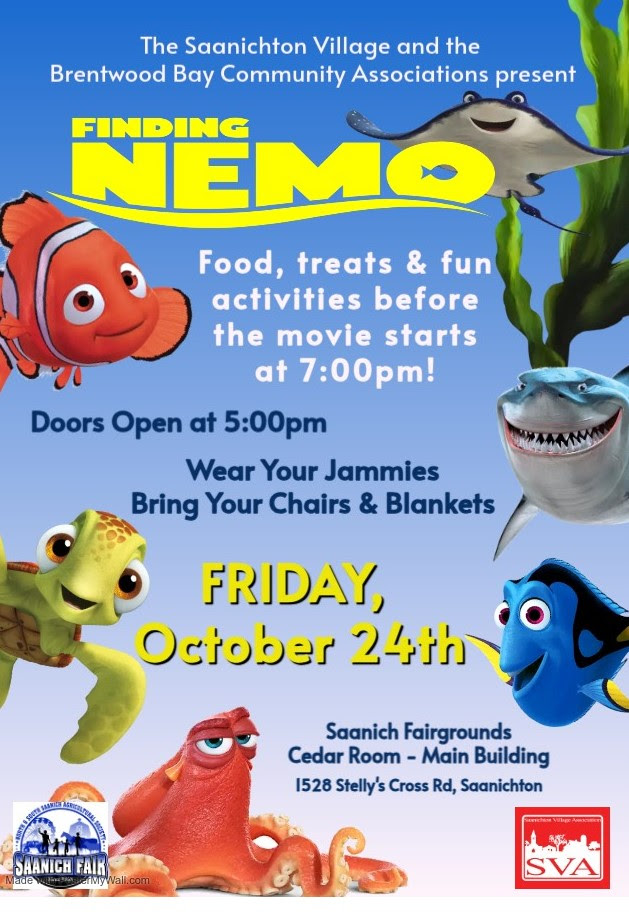 The Saanichton Village and the Brentwood Bay Community Associations present: Finding Nemo Food, treats & fun activities before the movie starts at 7pm! Doors open at 5:00pm Wear your jammies, bring your chairs & blankets When: October 24, 2025 Where: … Read More |