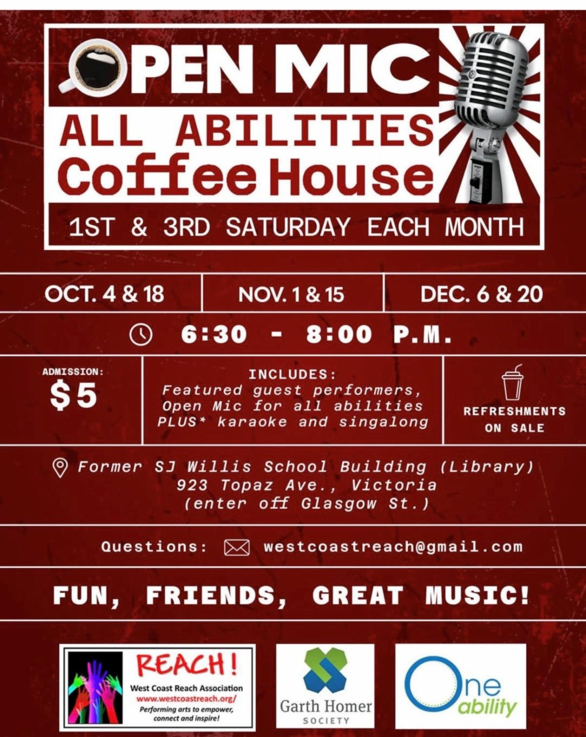 All abilities open mic coffee house - Including Open Mic, guest performers, karaoke and singalong. Music, spoken word, comedy...all welcome! Our featured guest performer on Oct. 18th is SEAN McCOOL from the band "Soul Shakers".