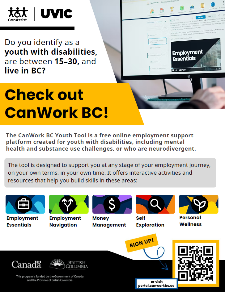 CanWork BC is a free online career preparation tool created to support youth (aged 15-30) with disabilities in BC. No formal diagnosis is required to sign up, and the tool is fully self-paced. It can be used independently or with support.
