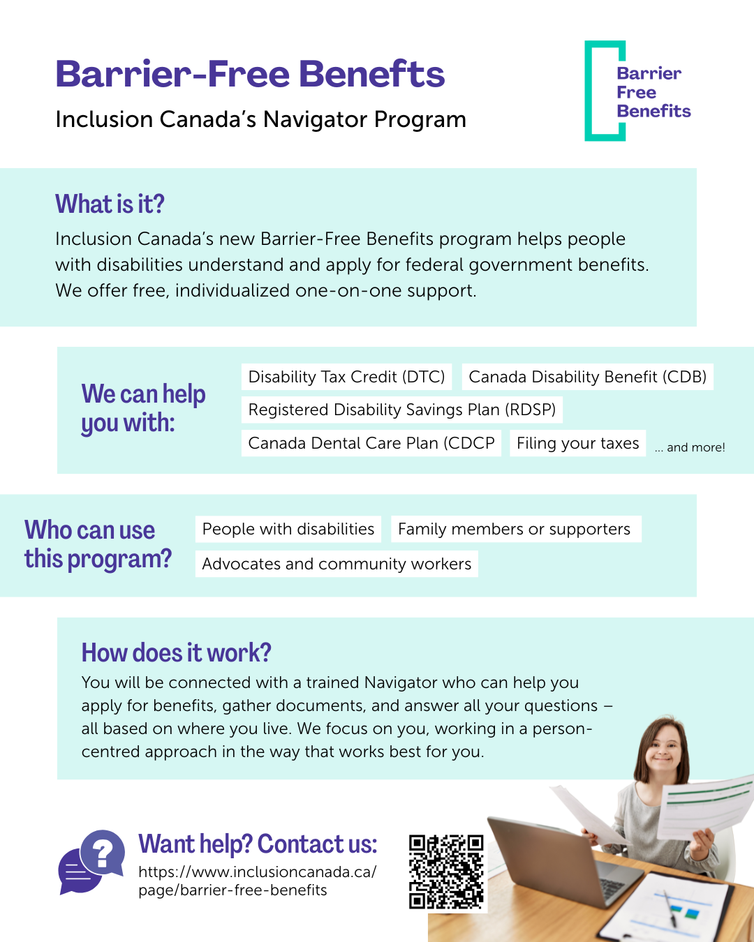 Inclusion Canada’s Barrier-Free Benefits program offers FREE, one-on-one help with disability benefits. Our Navigators are here to help you apply for benefits like: