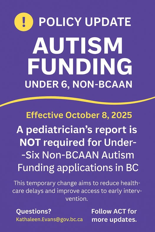 On November 8, 2025 the Ministry of Children and Family Development (MCFD) shared that as of October 8, 2025, Under-Six Non-BCAAN Autism Funding applications no longer require a pediatrician’s report. This is a temporary measure aimed at reducing processing delays for families applying for Autism Funding.